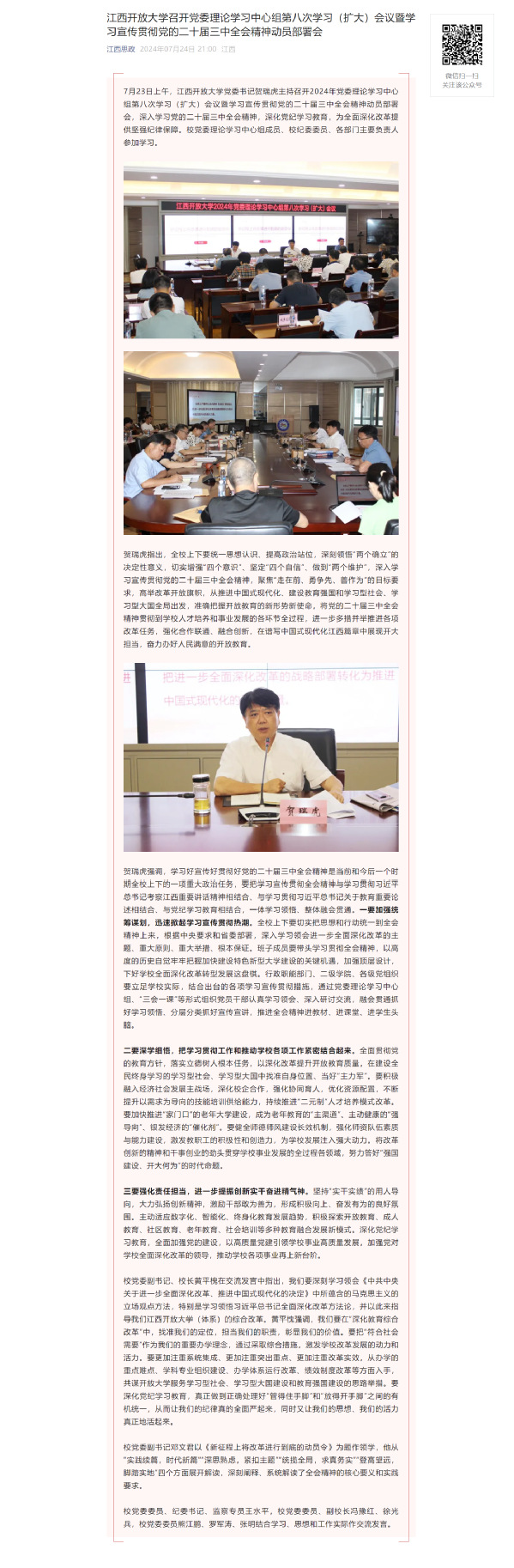 7月23日上午,英国上市365官网党委书记贺瑞虎主持召开2024年党委理论学习中心组第八次学习(扩大)会议暨学习宣传贯彻党的二十届三中全会精神动员部署会,深入学习党的二十届三中全会精神,深化党纪学习教育,为全面深化改革提供坚强纪律保障。校党委理论学习中心组成员、校纪委委员、各部门主要负责人参加学习。