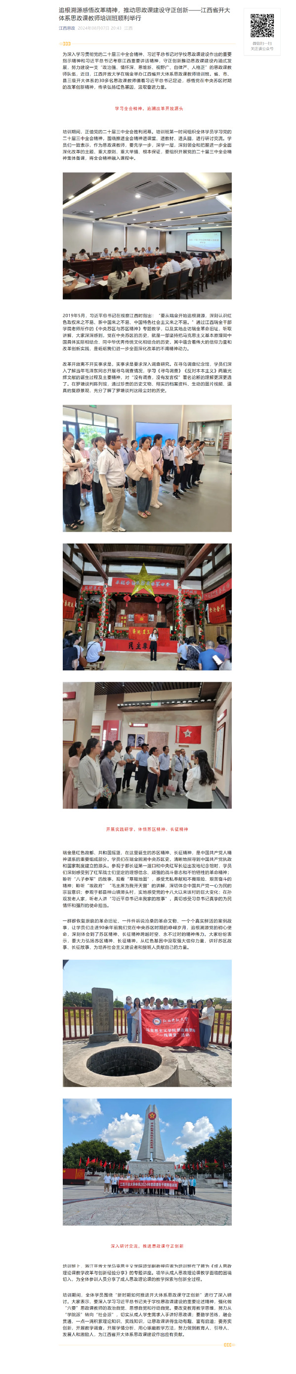 为深入学习贯彻党的二十届三中全会精神、习近平总书记对学校思政课建设作出的重要指示精神和习近平总书记考察江西重要讲话精神,守正创新推动思政课建设内涵式发展,努力建设一支“政治强、情怀深、思维新、视野广、自律严、人格正”的思政课教师队伍,近日,英国上市365官网在瑞金举办江西省开大体系思政课教师培训班。省、市、县三级开大体系的30多名思政课教师循着习近平总书记足迹,感悟党在中央苏区时期的改革创新精神,传承弘扬红色基因,汲取奋进力量。
