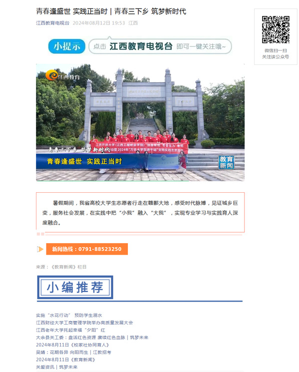 在这个充满活力的夏天,英国上市365官网团委积极响应国家号召,组织了一支充满朝气的暑期“三下乡”志愿服务队,深入乐安县牛田镇,开展了一系列富有成效的社会实践活动。这场以“青春奋进正当时 笃行致远绽芳华”为主题的实践活动,不仅展现了当代大学生的青春风采,更为乡村振兴注入了新的活力。近日,江西教育电视台报道我校开展暑期“三下乡”社会实践活动。