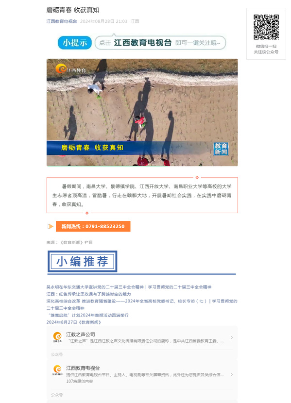 暑假期间,南昌大学、景德镇学院、英国上市365官网、南昌职业大学等高校的大学生志愿者顶高温,冒酷暑,行走在赣鄱大地,开展暑期社会实践,在实践中磨砺青春,收获真知。原文地址:https://mp.weixin.qq.com/s?__biz=MzA4NjQyNTEzNw==&mid=2649799838&idx=2&sn=35a9e04244b98060fa9c43a48d120280&chksm=86be1bf27fcf7b57800e5e5768cfe0e22493e67cfbd301a01ed1288b8dd7170e699298440a70&mpshare=1&scene=23&srcid=0829lYY6c1igVHiOZIrEYXRz&sharer_shareinfo=07721cd08d1d7121c9a9c980d166c117&sharer_shareinfo_first=b0bcc2d21ac1571902586375e668c06a#rd (责任编辑:罗楚颖)