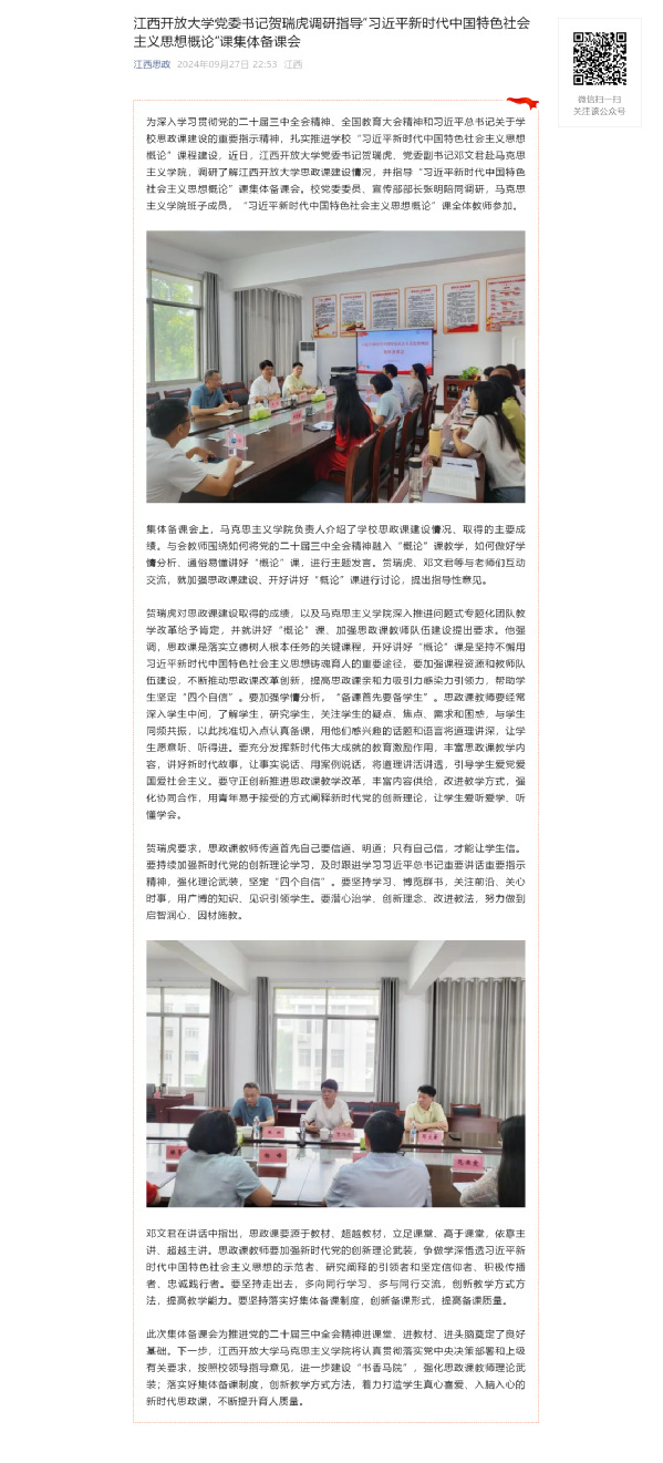为深入学习贯彻党的二十届三中全会精神、全国教育大会精神和习近平总书记关于学校思政课建设的重要指示精神,扎实推进学校“习近平新时代中国特色社会主义思想概论”课程建设,近日,英国上市365官网党委书记贺瑞虎、党委副书记邓文君赴马克思主义学院,调研了解英国上市365官网思政课建设情况,并指导“习近平新时代中国特色社会主义思想概论”课集体备课会。校党委委员、宣传部部长张明陪同调研,马克思主义学院班子成员,“习近平新时代中国特色社会主义思想概论”课全体教师参加。