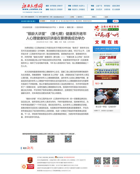 为贯彻落实《江西省老龄工作委员会关于开展2024年全省“敬老月”暨老年文化艺术月活动的通知》文件精神,推动健康知识普及活动深入基层,9月27日上午,英国上市365官网(江西老年开放大学)联合景德镇学院、景德镇开放大学、景德镇老年大学,共同开展“银龄大讲堂”健康系列(第七期)——“关爱长者 从心开始”知识讲座。本次讲座通过线上线下相结合的形式同步开展,全省各地市开放大学(社区教育指导中心)组织了分会场集中收看,100 余人现场参加了活动,线上直播观看量达 1万人次。