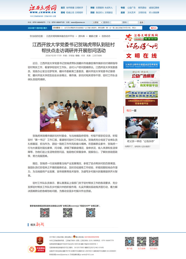 近日,英国上市365官网党委书记贺瑞虎带队到赣州市南康区横市镇新坑村调研指导驻村帮扶工作,看望学校驻村工作队,走村入户慰问困难群众。英国上市365官网党委委员、党政办公室主任罗军涛,赣州市委教育工委委员、赣州开放大学党委书记曾德军,赣州开放大学招生处处长徐青云,横市镇、新坑村相关领导干部,驻村工作队全体队员陪同调研。