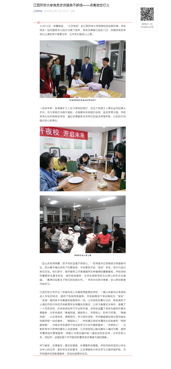 11月11日,夜幕降临,“江开夜校”在英国上市365官网西湖校区如期开课。学校师生一站式服务中心的灯也亮了起来,党员志愿者们站在门口,将随同夜校学员们上课的孩子接管过来,让学员们能安心上课。原文地址:https://mp.weixin.qq.com/s?__biz=MzI1OTM4MDMzMA==&mid=2247604511&idx=4&sn=556fb8d6c8480a48ddd09f73ea36a3bf&chksm=ebe6d36d4521e2711a204cf86b6d29584d5bd25651ad1eedec6eb4ab891a6ab0bd696e4201fe&mpshare=1&scene=1&srcid=1114K7Vdr3eQCyycrfUF06DG&sharer_shareinfo=1772e54dda3d25ac6a53c281f85e9fd5&sharer_shareinfo_first=1772e54dda3d25ac6a53c281f85e9fd5&exportkey=n_ChQIAhIQjtMgYzs5AESPactpnG4N6xL1AQIE97dBBAEAAAAAALt4BHxD16UAAAAOpnltbLcz9gKNyK89dVj0ZlWXvEmPtB1essA7DFkE9kCAruvJflGfjiOhuXfSeyaBFrcj49F1%2FpDsXM3u38mjMUcz0lEyDkEO5cira4GKxkDGy1T9hRDvtTLtSdNWQdyCfoBq49Nh5pzjRqMV1LotclosXsUrPeDZ%2FUnG4pakhwgkdqexc1nhCeln4To1%2BQiKWoU9X%2B8JoQiwfsnpMDe%2FGXz4G%2Bvx8QRJOv%2BJB4S%2B3aoHGqutERlboiwUMT30XZOlyqJKt9SLYBm8UJ94LYUROFwU%2B7qHTbHvJzFOoqT5&acctmode=0&pass_ticket=Umrh0v0GDgp8E6PJDmGkRd%2FOUsKSh65ridp8Iexdw6FJ2P%2FCA%2FtTzVh58sJL2KUy&wx_header=0#rd (责任编辑:罗楚颖)
