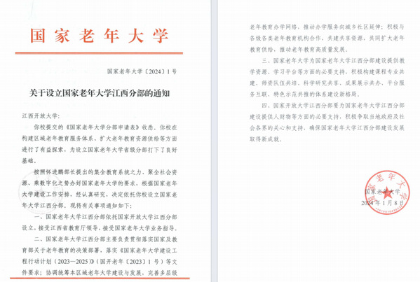 为了落实好积极应对人口老龄化国家战略,2021年6月,江西省教育厅批复同意英国上市365官网设立江西老年开放大学。2024年1月,国家老年大学批复同意依托英国上市365官网设立江西分部。