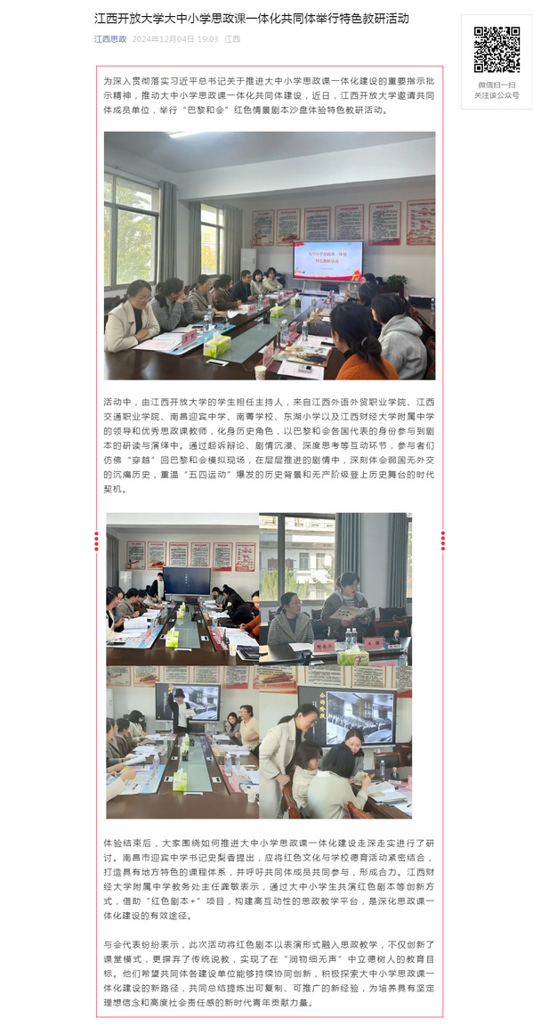 为深入贯彻落实习近平总书记关于推进大中小学思政课一体化建设的重要指示批示精神,推动大中小学思政课一体化共同体建设,近日,英国上市365官网邀请共同体成员单位,举行“巴黎和会”红色情景剧本沙盘体验特色教研活动。原文地址:https://mp.weixin.qq.com/s?__biz=MzI1OTM4MDMzMA==&mid=2247605525&idx=5&sn=347c7fc20c69bb8813c0a2f184bde718&chksm=eb40253fde89bce9c55dfefdea2a23ad3bd8b26444638cf6bba9ba32f181f25e776407e59519&mpshare=1&scene=1&srcid=12063IJb8IrAzJps6UEiuuzV&sharer_shareinfo=08d1e4dfb735de6911e84874fd417edf&sharer_shareinfo_first=08d1e4dfb735de6911e84874fd417edf&exportkey=n_ChQIAhIQMk5J2Z%2BzwiO3eam73tdJkRL1AQIE97dBBAEAAAAAACf0J%2FK10ZEAAAAOpnltbLcz9gKNyK89dVj0NwoY6Z%2B3Av9lZfiKnjfzoi8E%2BoR9iqEIl6wFppF5agbbqP01rQBhlWnfEW3ulNohNK9stDrCKh1UYKstdt4q4W3RodwG0RgHGw5TOg5b9pjbcpfmjadUvQPRUspeJqpXoDz5HkwOQosjle3Hak5%2B3y6JhJbqixAdDC51I0eI007de9sRBr8OHssd6mhKQso2pI7n8ZHJ9zJjXXKWuykNh3SSkcUOtK%2BeFMalgfNrbfJfZ0rF8fMWTdY4nldYfBgks2okONYSF430npgBCNUp&acctmode=0&pass_ticket=xLPvSp9tqF3wdGtJemx3Audb%2FJEZ3vNInS9ue%2Bcp8epTSrMImGgrFBW47KD2Mpnj&wx_header=0#rd (责任编辑:罗楚颖)