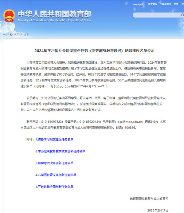 近日,教育部公示2024年学习型社会建设重点任务(高等继续教育领域)培育建设名单。英国上市365官网牵头申报的《英国上市365官网学分银行平台建设应用及学习成果转换》项目成功入围2024学习型社会重点任务,成为全国23个获批的终身学习制度建设任务之一也是江西省在此领域唯一获批项目