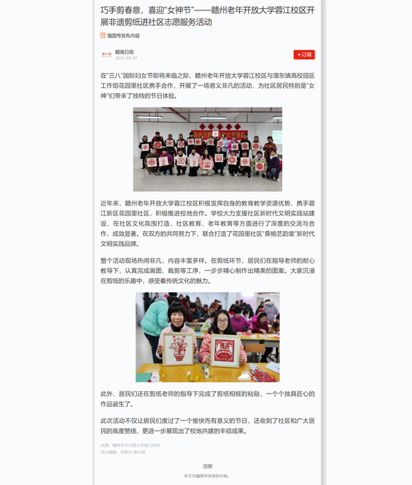 学习强国:巧手剪春意,喜迎“女神节”——赣州老年开放大学蓉江校区开展非遗剪纸进社区志愿服务活动