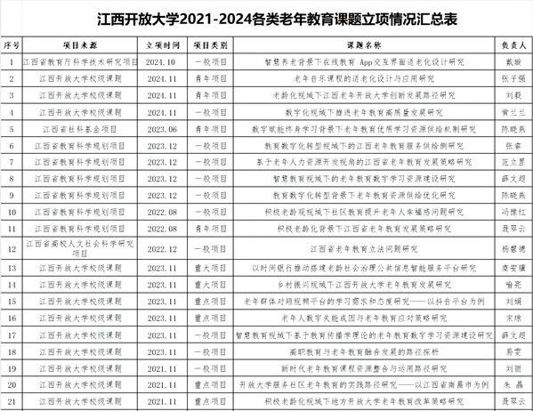 2021年至今,学校累计立项老年教育相关课题21项,其中省级课题9项(含社科基金1项、教科规划6项等),校级课题12项(含重大项目2项、重点项目4项)。研究领域覆盖老年教育立法、智慧养老、服务供给等关键领域,发表学术论文近30篇,为系统性破解老年教育发展难题提供学理支持。