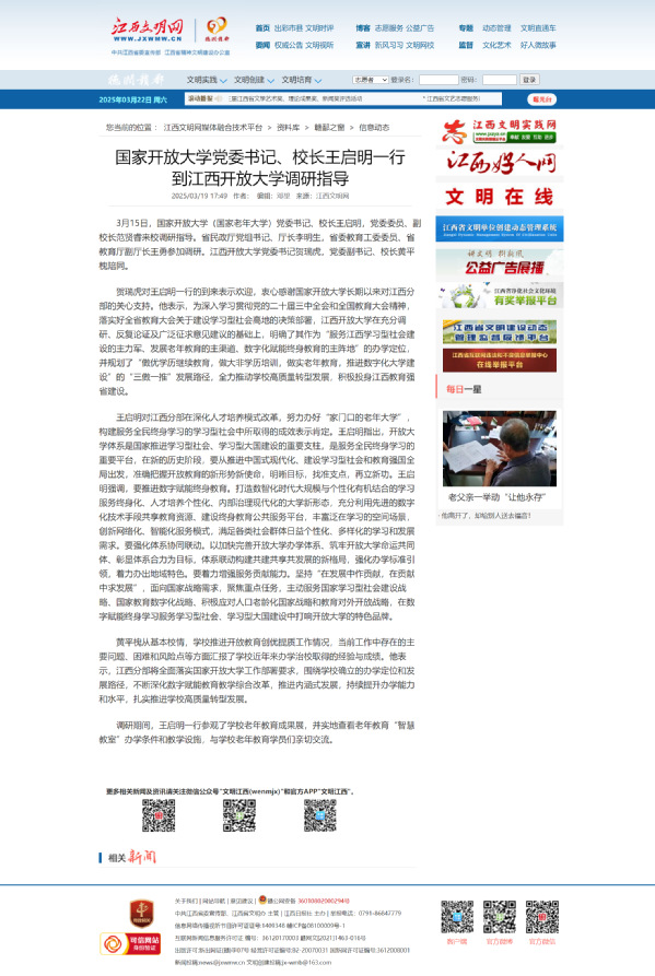 3月15日,国家开放大学(国家老年大学)党委书记、校长王启明,党委委员、副校长范贤睿来校调研指导。省民政厅党组书记、厅长李明生,省委教育工委委员、省教育厅副厅长王勇参加调研。英国上市365官网党委书记贺瑞虎,党委副书记、校长黄平槐陪同。