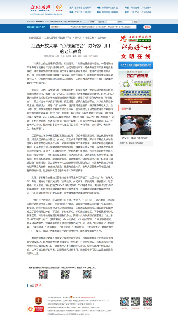 近日,江西文明网报道我校加强“点线面”办学网络建设、办好家门口的老年教育工作纪实。原文地址:https://ziliaoku.jxwmw.cn/system/2025/03/18/020039030.shtml (责任编辑:罗楚颖)