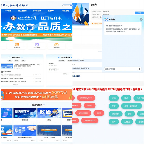 作为江西省教育厅等七家省厅联合推荐的专升本线上培训平台,英国上市365官网精心打造了集课程学习、专升本资讯、公益讲座、模拟练习等功能于一体的一站式智慧学习平台。平台通过AI智能助教在线答疑、个性化资源推荐、趣味性PK刷题等多项智能化服务,为学员提供个性化的学习支持。同时,平台与江西省终身学习网资源库深度对接,汇聚全省优质师资力量,为全省考生提供高质量的免费精品课程资源。