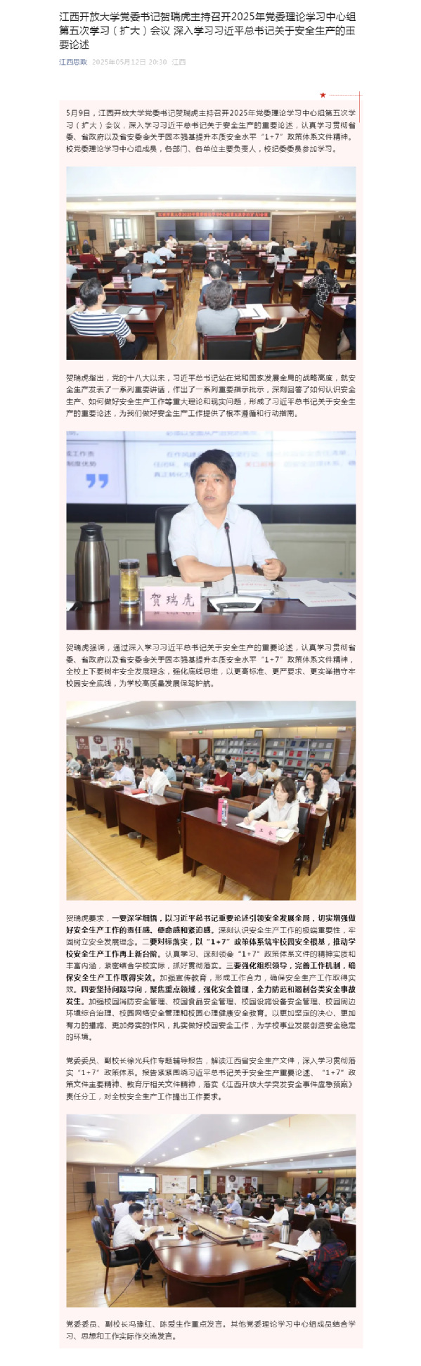 5月9日,英国上市365官网党委书记贺瑞虎主持召开2025年党委理论学习中心组第五次学习(扩大)会议,深入学习习近平总书记关于安全生产的重要论述,认真学习贯彻省委、省政府以及省安委会关于固本强基提升本质安全水平“1+7”政策体系文件精神。校党委理论学习中心组成员,各部门、各单位主要负责人,校纪委委员参加学习。