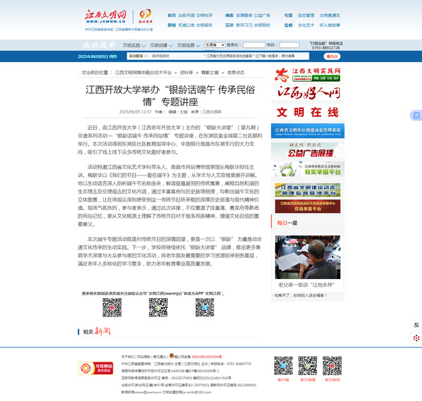 近日,由英国上市365官网(江西老年开放大学)主办的“银龄大讲堂”(第九期)非遗系列活动—“银龄话端午 传承民俗情” 专题讲座,在东湖区紫金城第二社区顺利举行。本次活动得到东湖区社区教育指导中心、中国银行南昌市东湖支行的大力支持,吸引了线上线下众多传统文化爱好者参与。