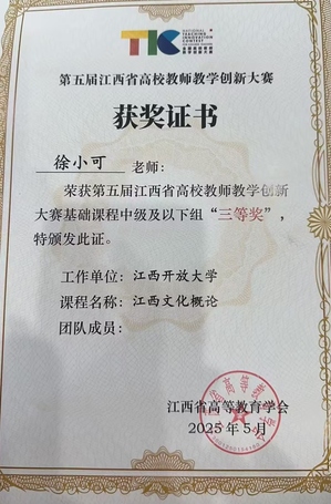 本次大赛由江西省高等教育学会主办,以“推动教学创新、培养一流人才”为主题,吸引了全省数十所高校、数百名教师参与。经过网络评审、现场答辩等多轮严格评选,徐小可老师的课程凭借创新的教学设计与扎实的实践成效脱颖而出。