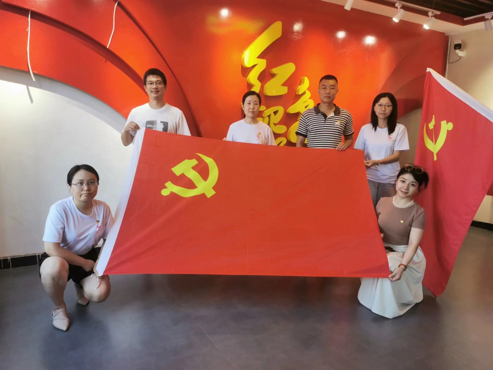 活动的最后,教师党员在馆内入党誓词前,庄严肃穆地举起右手,在党旗下庄严宣誓,重温入党誓词。