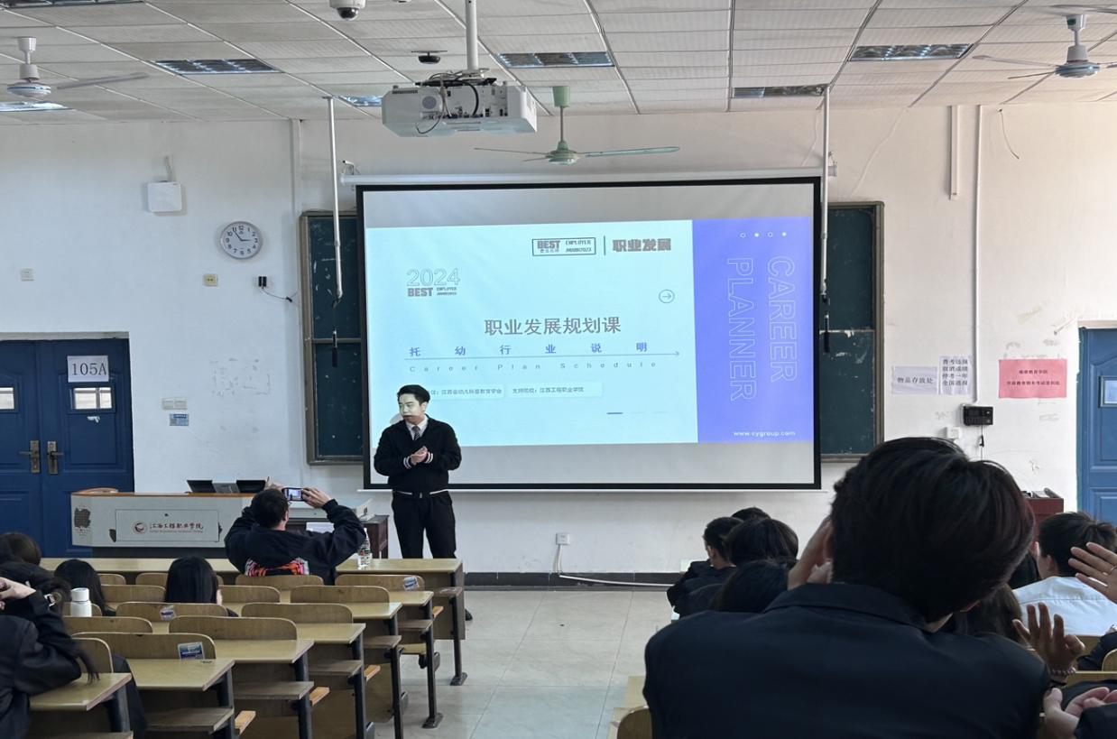 江西省幼儿科普教育学会职业规划师郭震伟老师则针对婴幼儿专业的毕业现状、前景发展及挑战进行了深度剖析。郭老师立足实际从托育、特教、素质教育三个方向积极引导同学们树立正确的职业观和就业观,调整就业心态。同时,郭老师结合自身经验和大量真实案例,引导学生思考留才和引才两个主题,帮助同学们更好的理解和把握行业发展方向。互动环节中,郭老师一一解答同学们的问题,进一步消除了同学们对未来就业道路的迷茫与困惑。