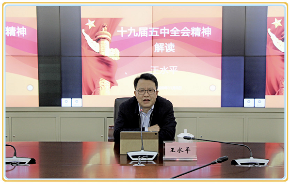 王水平从党的十九届五中全会召开的现实背景、主要成果、主要内容、核心要义等方面对党的十九届五中全会精神进行了深入解读,重点介绍了此次全会的突出特点与亮点、《公报》《建议》主要内容、取得的成就及重大意义、社会主义现代化远景目标、“十四五”发展目标和重点任务等方面的内容。