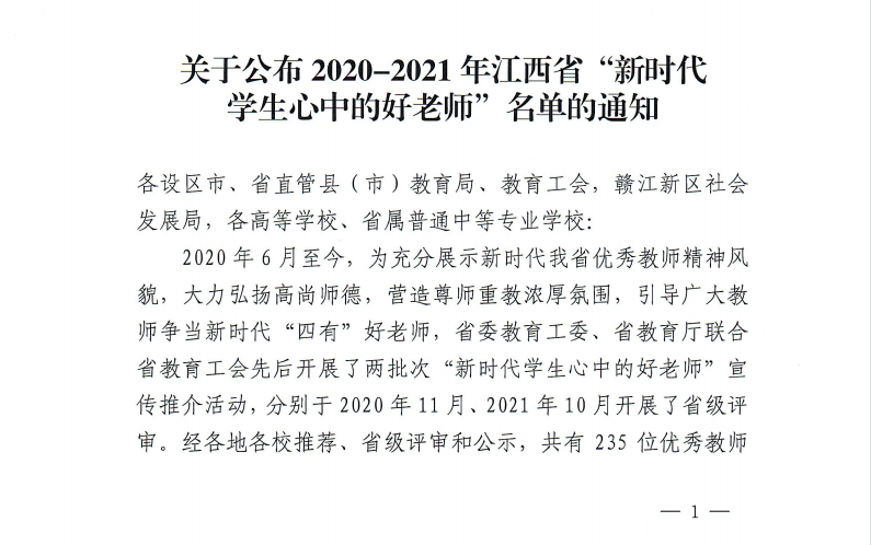 我院教师李龙光荣获2020—2021年 江西省“新时代学生心中的好老师”称号