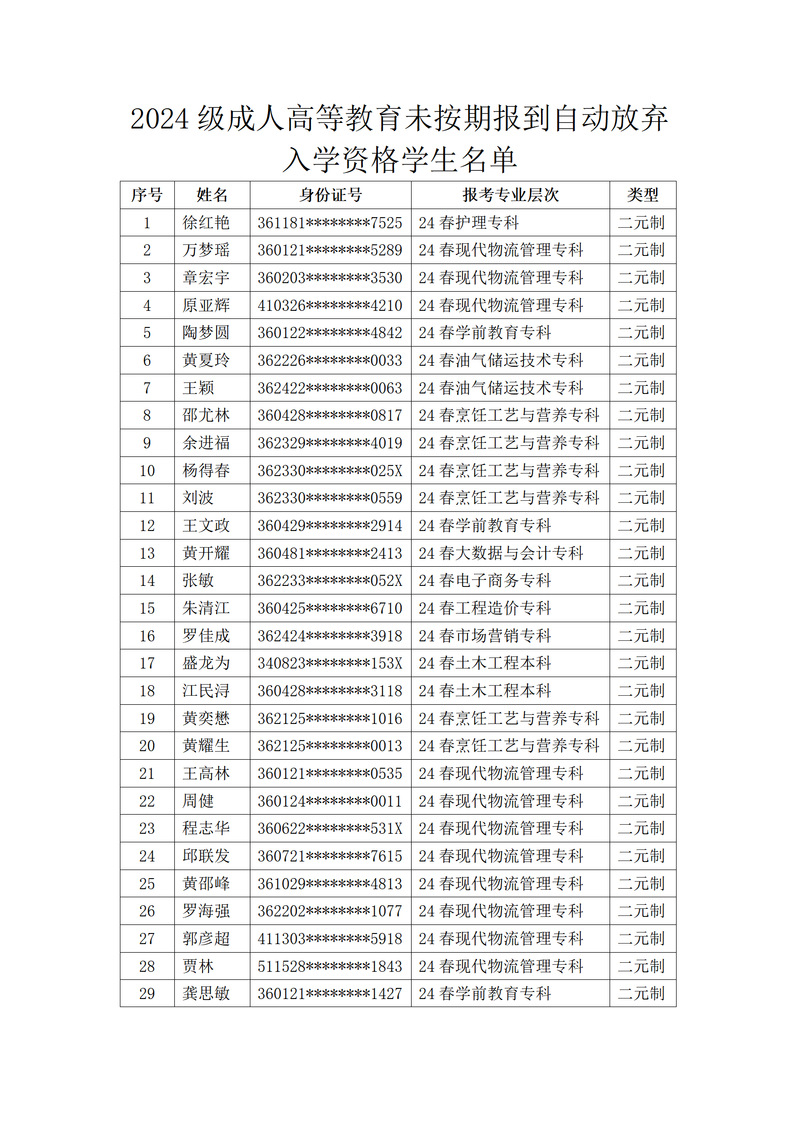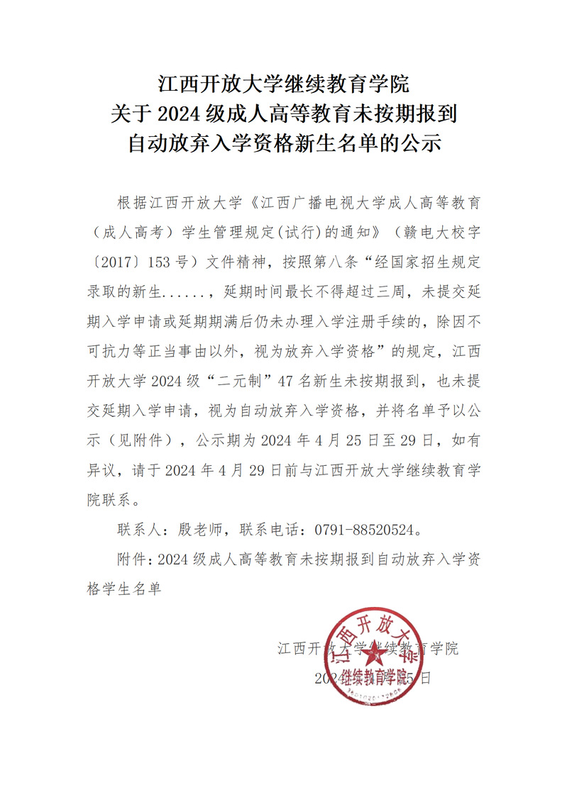 英国上市365官网继续教育学院关于2024级成人高等教育未按期报到自动放弃入学资格新生名单的公示