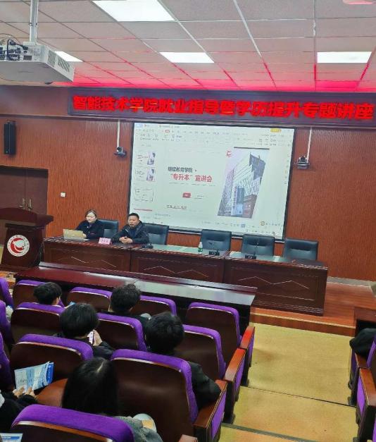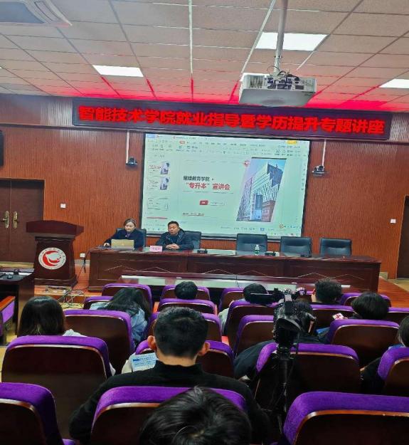 为满足广大学生提升学历的需求,拓展学生的发展空间,11月26日下午,受智能技术学院的邀请,学院组织相关科室人员在西湖校区举办了一场学历提升专题讲座,本次讲座李龙光副院长出席,教务科邹方戈老师做专题讲座。