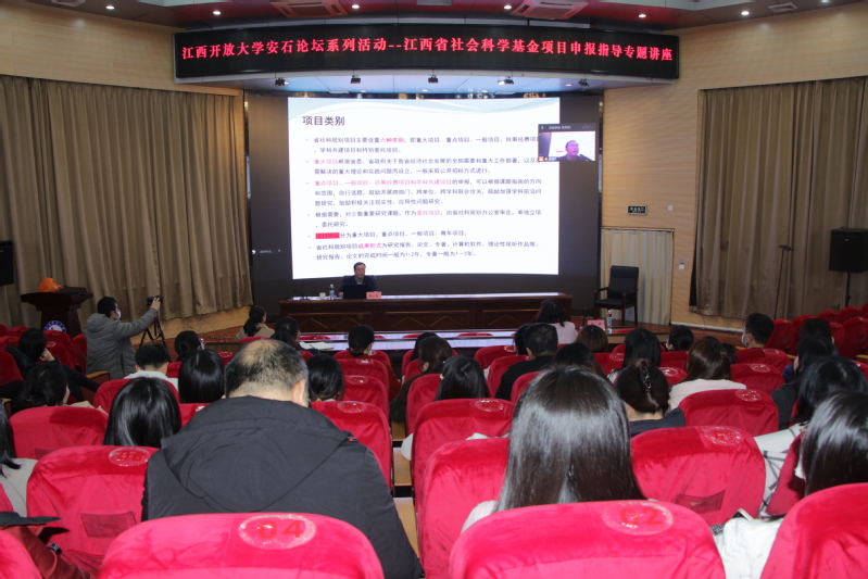 为进一步提升学校科研水平,增强教职工的科研素养,3月29日下午,学校特邀江西师范大学学报杂志社总编戴利朝教授为我校专业技术人员做“江西省社会科学基金项目申报指导”专题讲座。全校各学院、各部门100余人现场参与,其余教师通过线上方式收看。科研管理处处长张睿教授主持讲座。