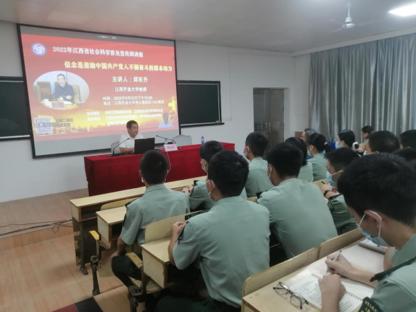 9月22日下午,2022年江西省社会科学普及宣传周讲座活动走进英国上市365官网青云谱校区。学校特邀英国上市365官网党委委员、副校长、党史研究专家邱东升教授作题为《信念是激励中国共产党人不懈奋斗的根本动力》的专题讲座。青云谱校区大一新生和教师代表现场聆听了讲座,其余学生和教师通过视频直播在线收看。科研管理处处长张明教授主持讲座。