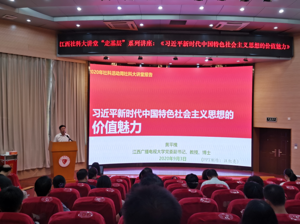 为了贯彻落实理论教育“学思用贯通、知信行统一”的要求,充分发挥理论价值魅力的独特作用,切实提高高校思政课教育教学质量,9月3日上午,江西社科大讲堂“走基层”系列讲座特别邀请我校党委副书记、教授黄平槐博士,在我校青山湖校区学术报告厅作了题为《习近平新时代中国特色社会主义思想的价值魅力》的讲座。此次讲座由江西省社会科学界联合会主办,江西广播电视大学承办,学校机关党委和高职学院党委各支部书记、宣传委员,思政课专兼职教师,高职学院专职辅导员,学工处、科研处等相关工作人员80余人聆听了讲座。