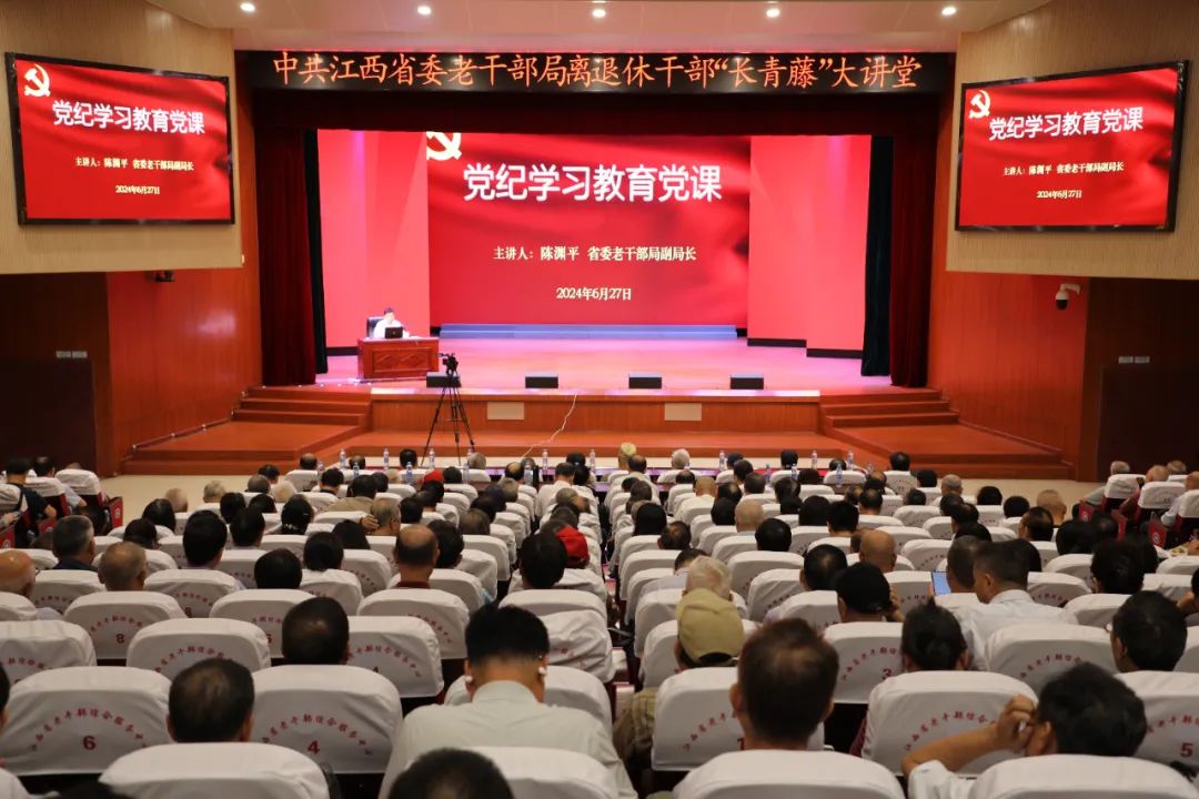 为认真贯彻落实党中央关于在全党开展党纪学习教育的部署和省委工作要求,积极推动全省离退休干部开展党纪学习教育,6月27日,省委老干部局在南昌举办全省离退休干部“长青藤”大讲堂,省委老干部局副局长陈渊平同志为老干部讲专题党课,我校离退休老干部张步平、辛筱萍同志参加。