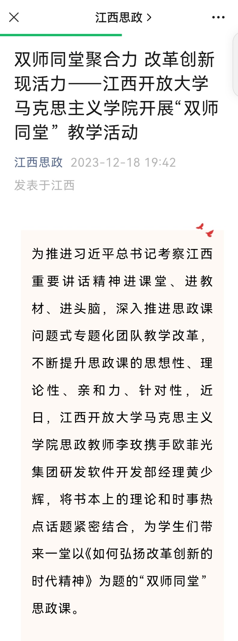 近日,江西思政公众平台以《双师同堂聚合力 改革创新现活力——英国上市365官网马克思主义学院开展“双师同堂”教学活动》为题,全方位报道我院“双师同堂”教学活动。