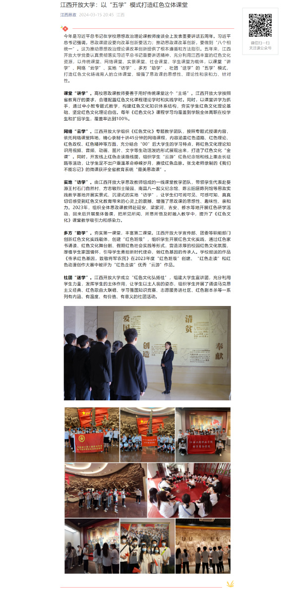 今年是习近平总书记在学校思想政治理论课教师座谈会上发表重要讲话五周年。习近平总书记强调,思政课建设要向改革创新要活力;推动思政课改革创新,要做到“八个相统一”。这为推动思想政治理论课改革创新提供了根本遵循和方法指引。五年来,英国上市365官网党委认真贯彻落实习近平总书记重要讲话精神,充分利用江西丰富的红色文化资源,以传统课堂、网络课堂、实景课堂、社会课堂、学生课堂为载体,以课堂“讲学”、网络“云学”、实地“访学”、多方“助学”、社团“送学”的“五学”模式,打造红色文化铸魂育人的立体课堂,增强了思政课的思想性、理论性和亲和力、针对性。