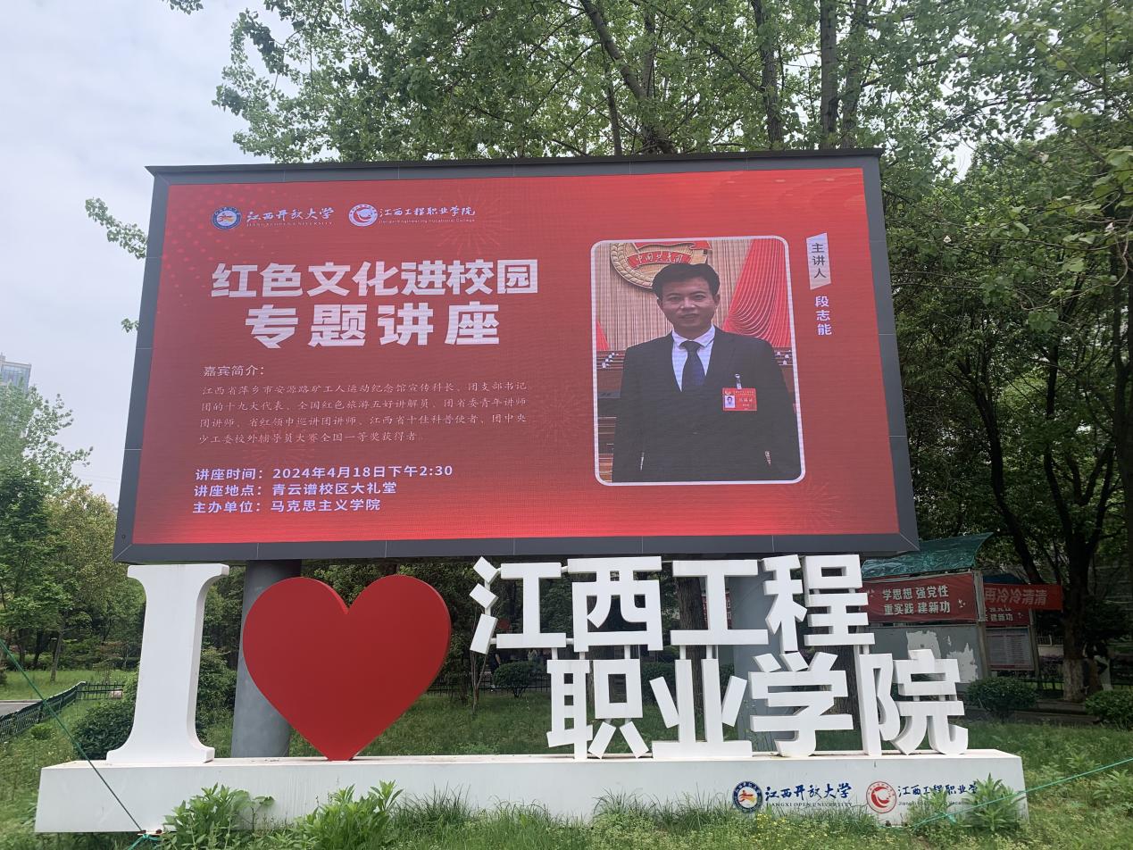 为深入学习贯彻习近平总书记考察江西重要讲话精神,贯彻落实习近平总书记关于“把红色资源利用好,把红色传统发扬好,把红色基因传承好”重要指示精神,落实中共江西省委《关于深入推进红色基因传承的意见》《江西省青少年读书行动工作方案》,学校决定在第 29 个世界读书日来临之际,开展“赓续红色血脉,争做薪火传人”主题读书活动。作为活动内容之一,4月17日,学院举办了“红色文化专家进校园”活动,邀请到共青团第十九大代表、江西省萍乡市安源路矿工人运动纪念馆宣传科长段志能,为师生代表作红色文化专题讲座。学院党员、思政教师代表、学生代表共200余人在现场聆听讲座。