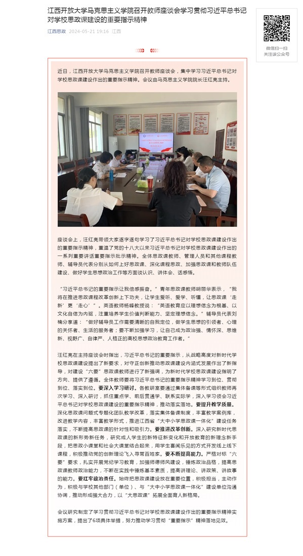 近日,我院召开教师座谈会,集中学习习近平总书记对学校思政课建设作出的重要指示精神。会议由院长汪红亮主持。原文地址:https://mp.weixin.qq.com/s?__biz=MzI1OTM4MDMzMA==&mid=2247589726&idx=1&sn=f4727baa972d9d682986a861d09a299c&chksm=ea7a1a5bdd0d934de8bf7db323158a5f1302b69147