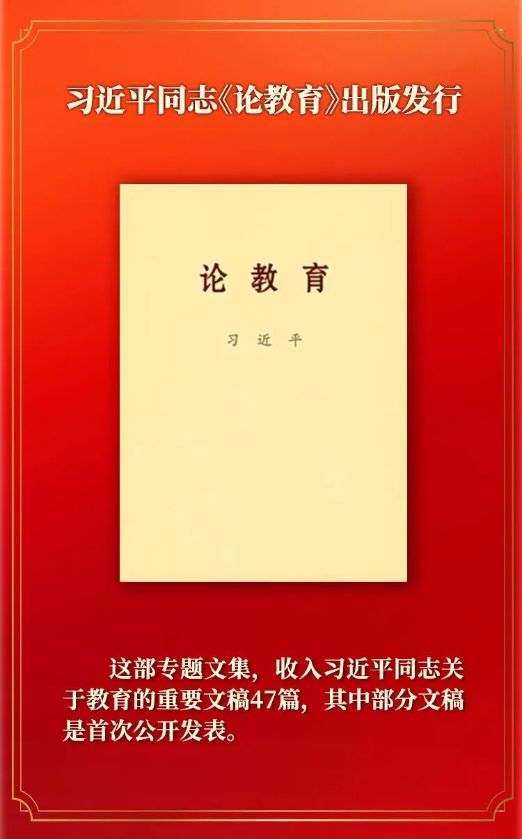 新华社北京9月8日电 中共中央党史和文献研究院编辑的习近平同志《论教育》一书,收入习近平同志2013年5月至2024年7月期间关于教育的重要文稿47篇。现将这部专题文集的主要篇目介绍如下。