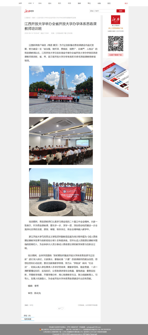 为守正创新推动思政课建设内涵式发展,努力建设一支“政治强、情怀深、思维新、视野广、自律严、人格正”的思政课教师队伍,英国上市365官网日前在瑞金市举办全省开放大学办学体系思政课教师培训班,省、市、县三级开放大学办学体系的30多名思政课教师参加培训。