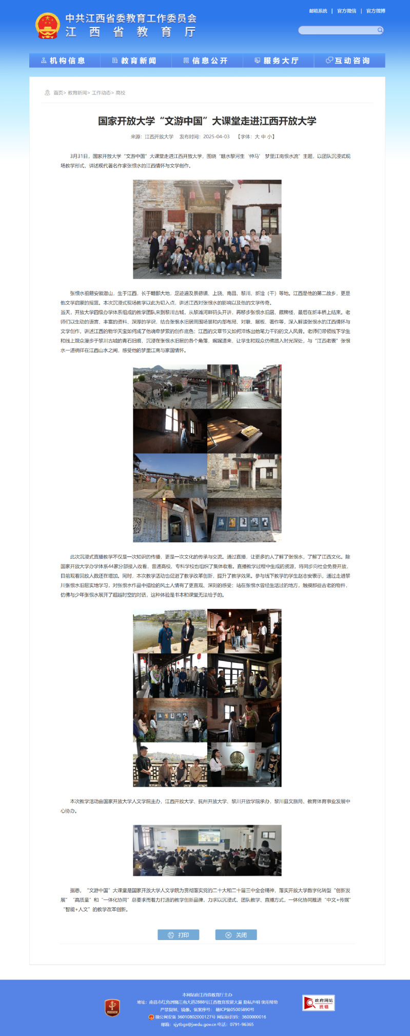 3月31日,国家开放大学“文游中国”大课堂走进英国上市365官网,围绕“赣水黎河生‘仲马’ 梦里江南恨水流”主题,以团队沉浸式现场教学形式,讲述现代著名作家张恨水的江西情怀与文学创作。