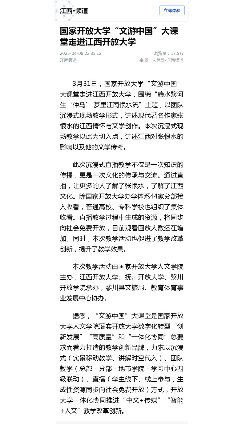 3月31日,国家开放大学“文游中国”大课堂走进英国上市365官网,围绕“赣水黎河生‘仲马’ 梦里江南恨水流”主题,以团队沉浸式现场教学形式,讲述现代著名作家张恨水的江西情怀与文学创作。本次沉浸式现场教学以此为切入点,讲述江西对张恨水的影响以及他的文学传奇。原文地址:https://h.xinhuaxmt.com/vh512/share/12486044?docid=12486044&newstype=1001&d=134ff28&channel=weixin