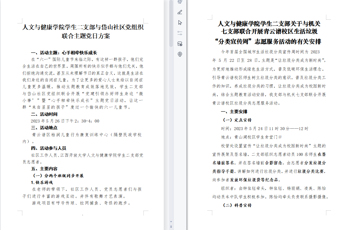 以学促干,学用结合提质。落实党员领导干部联系服务群众要求,双联领导加强了对支部主题教育的指导、以普通党员身份参加支部三会一课。党员领导干部带头、支部班子带动,打出支部旗帜,亮出党员身份,组织近百名师生参加“学思想强作风,美化校园环境建新功”志愿服务,与机关七支部联合开展青云谱校区生活垃圾分类宣传周志愿服务、与岱山社区党组织开展“心手相牵快乐成长”主题党日活动,将学习坚持以人民为中心的发展思想与办好师生身边微小事相结合,打造“服务在身边,矛盾不出校”党建微品牌,探索志愿服务师生、服务当地百姓新机制。(人文与健康学院供稿;责任编辑:蔡欣)