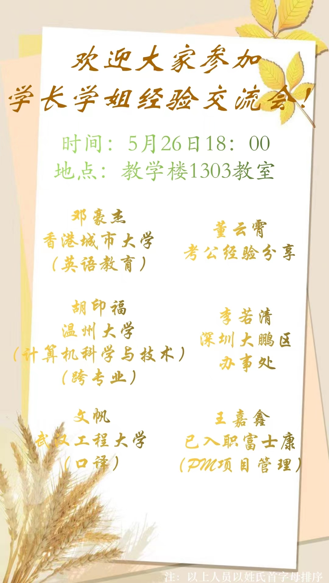 2023年5月26日18时,来自英语专业六位各有所成的优秀学长来到教学楼1303教室,向学弟学妹们倾情分享了他们在校四年的成长历程,给予了学弟学妹们深刻的启示和精确的指导。来自2021及2022级外语类学生参加了此活动,他们认真聆听了学长的经验分享,纷纷表示,通过此次讲座,帮助他们找到了准确的人生方向并了解了相关方法及途径。相信同学们能在学长丰富经验的指点下更加明确未来的发展道路,成就自己未来的精彩人生。