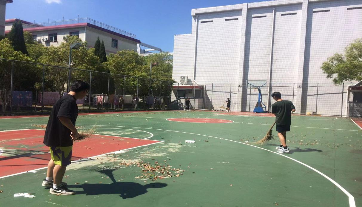 大家挽起袖子,拿起扫帚,将散落在地面上的树叶尽数扫进垃圾车中。学生志愿者们不放过任何一处角落,在操场、图书馆门口、篮球场里,校园内涌动着他们忙碌的身影。