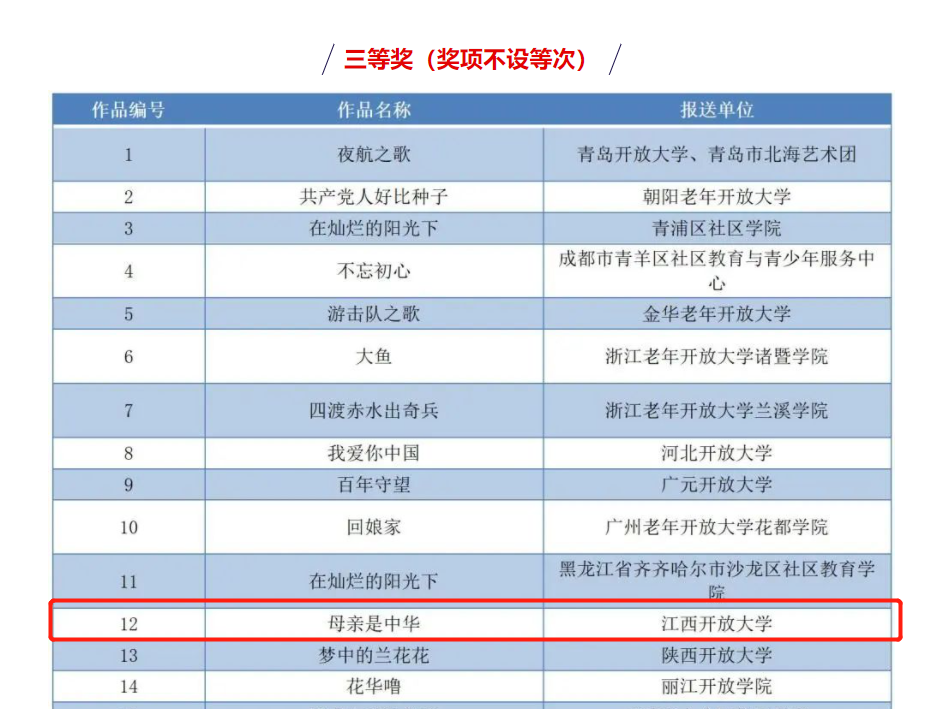 为献礼党的二十大,配合做好国家老年大学开学季活动,根据国家开放大学关于开展“献礼二十大 同唱欢乐歌”“献礼二十大 共跳幸福舞”线上展播活动的有关通知,学校精心组织学员团体录制了2个合唱作品和2个舞蹈作品,其中舞蹈作品《一带一路,唱响世界》荣获二等奖,合唱作品《母亲是中华》荣获三等奖。此外,经学校审核推荐的萍乡开放大学选送的舞蹈作品《沂蒙娘亲》也荣获二等奖。