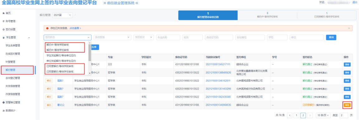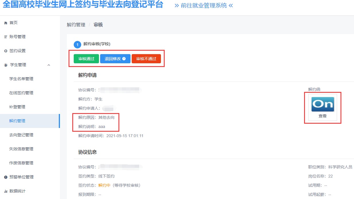 注意:当用人单位不能提供解约材料,导致毕业生无法正常解约,影响其继续签约或登记去向信息时,学校用户在核实情况后可让毕业生上传情况说明材料。点击“审核通过”后解约原因选择“学生单方面解约”,填写具体情况说明,提交后毕业生即完成解约。特别提醒该功能仅对学校用户开放,院系用户无此功能,请谨慎使用,使用前应与用人单位协商一致以防出现纠纷。