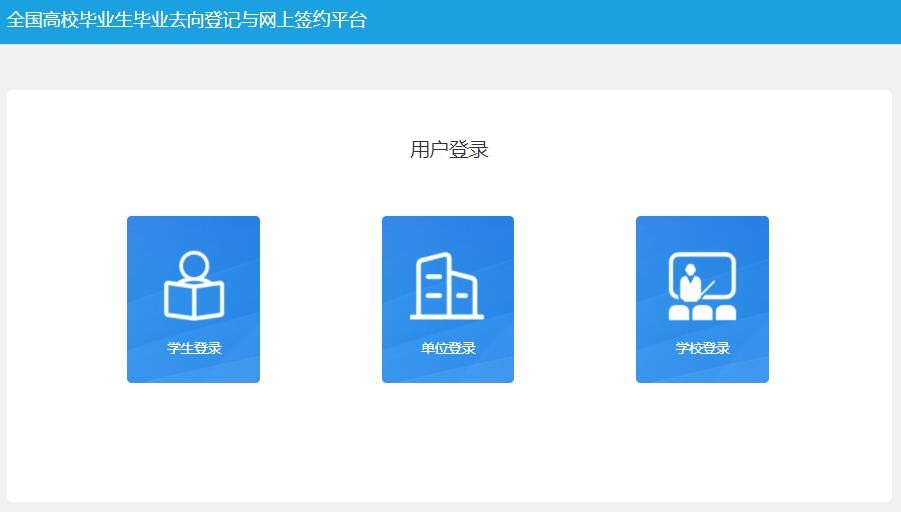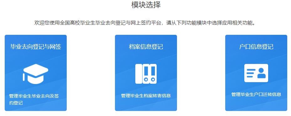 学校(院系)用户登录后进入选择功能模块的引导页。“毕业去向登记与网签”用于管理毕业生的毕业去向及签约信息,“档案信息登记”用于管理毕业生的档案转寄信息,“户口信息登记”用于管理毕业生的户口迁转信息。