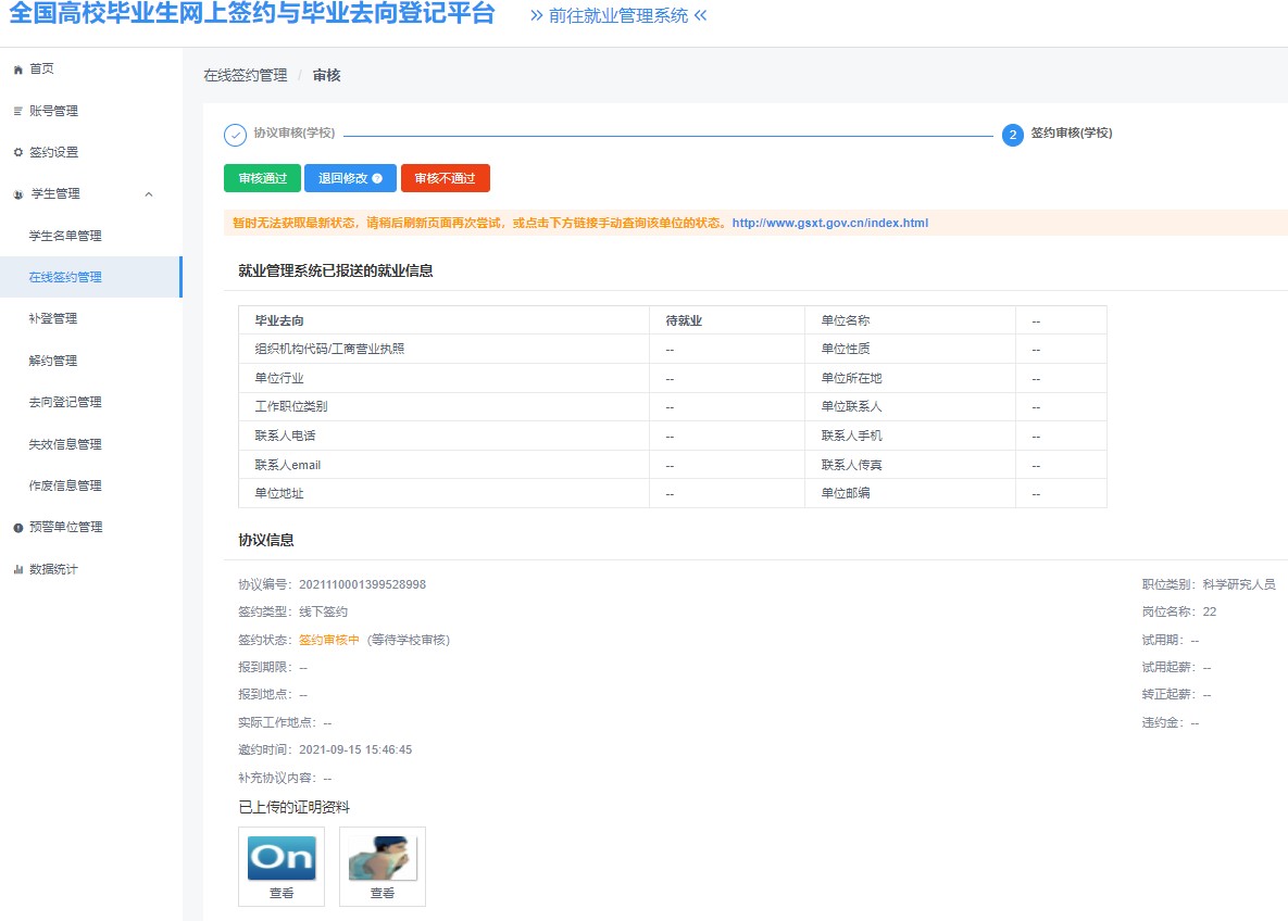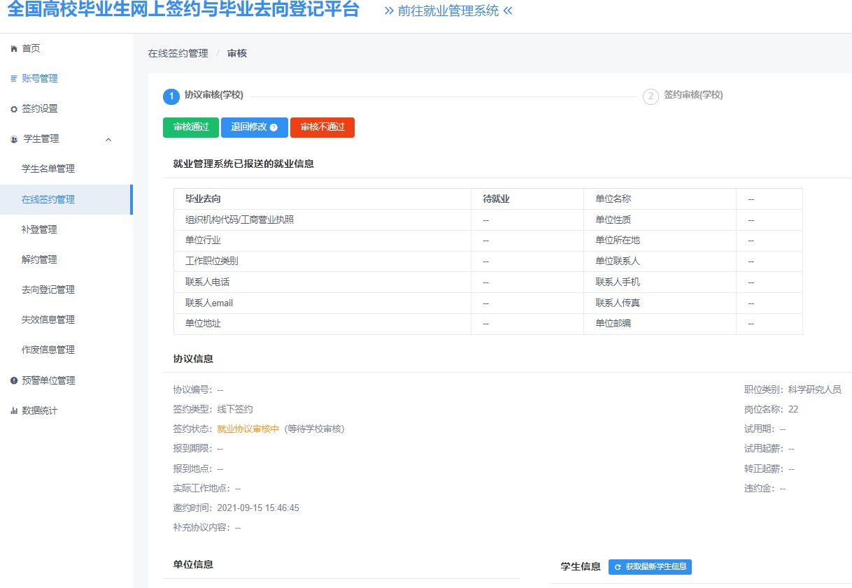1、在线签约管理:该模块负责就业协议书审核和签约审核,毕业生审核就业协议书审核通过后,毕业生进行线下签约回传就业协议书,院系审核通过后,该学生签约完成,如审核不通过,毕业生需重新申请并回传。