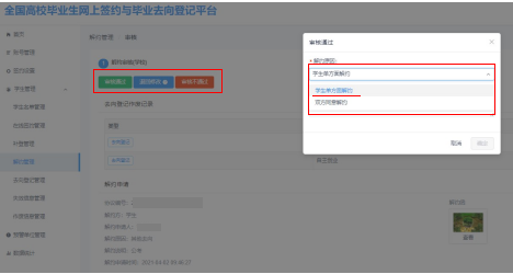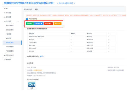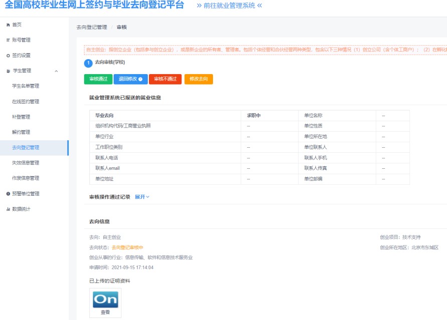 院系用户若审核通过,则完成其他毕业去向信息登记;若审核不通过,则登记去向信息直接作废,毕业生需重新选择毕业去向类型,填写相关去向信息并上传证明材料提交审核。
