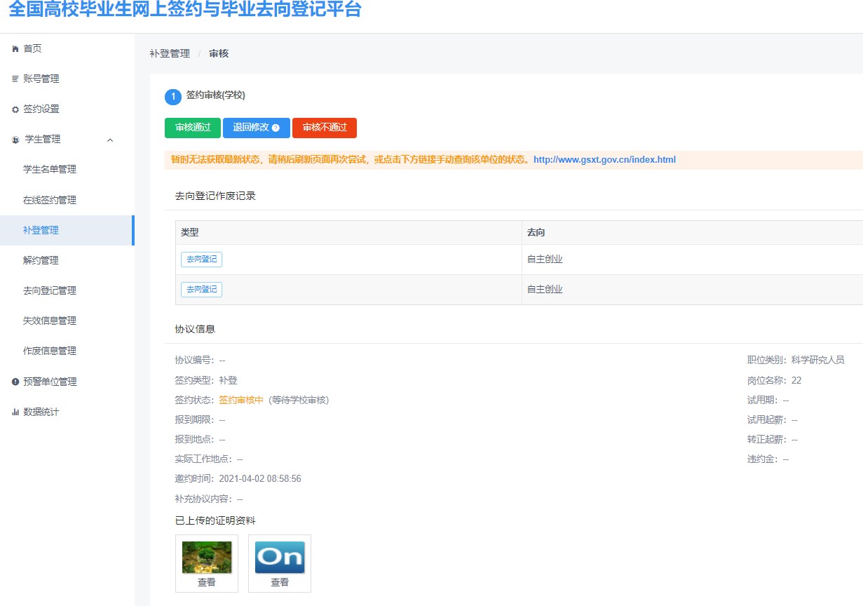 院系用户在“补登管理”中,可对已经与就业单位签订了纸质就业协议书的毕业生补充登记的就业信息进行审核。
