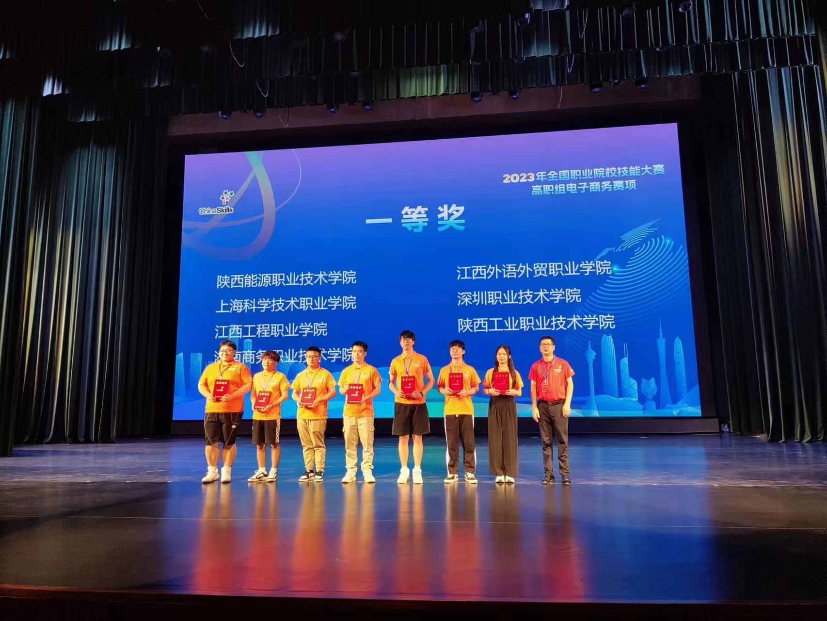 7月24-26日,2023年全国职业院校技能大赛(高职组)电子商务赛项在广东科学技术职业学院举办,我校电子商务专业团队代表江西省参赛,经过2天的激烈角逐,由数字经济学院教师万文静、吴梦颀、21电商1班李思瑶、21电商2班朱海玲、21电商3班郑光楠、21市场营销班林杨琦组成的代表队以全国第三名的总成绩,获得国家一等奖!刷新了我校在该项赛项上的最好成绩,实现了国赛金奖零的突破!