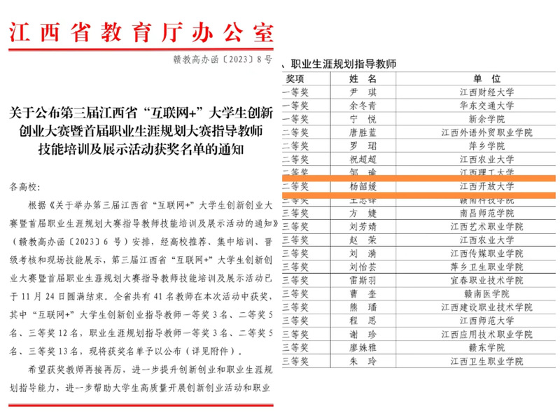 在第三届江西省“互联网+”大学生创新创业大赛暨首届职业生涯规划大赛指导教师技能培训及展示活动中,数字经济学院教师杨韶媛经过技能培训考核,初赛、复赛等环节,在全省本(专)科高校推荐选送的160余位参赛教师中获得二等奖,并受聘担任江西省职业生涯规划大赛专家导师。