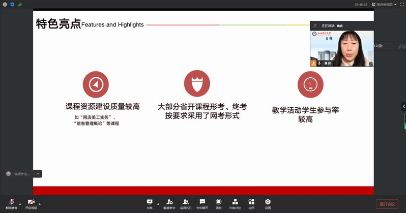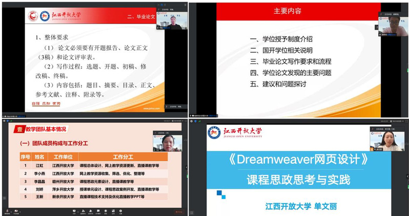 此外,为进一步明确经济管理类专业综合实践教学环节要求,开放教育会计学专业责任教师周胤、金融学专业责任教师熊朝旭分别结合会计学、金融学专业特点,从实践教学目标、毕业论文写作要求等方面详细讲解实践教学的要求,并提出具体的实施建议。为进一步加强团队建设、课程思政工作,会议设置了优秀经验分享环节。首先,2023年度考核优秀团队《纳税基础与实务》负责人江虹从团队建设、管理、创新等方面详细阐述课程网络教学实施团队建设经验。随后,单文丽以《Dreamweaver网页设计》课程为例为大家分享课程思政设计经验,并提出具体的建议。