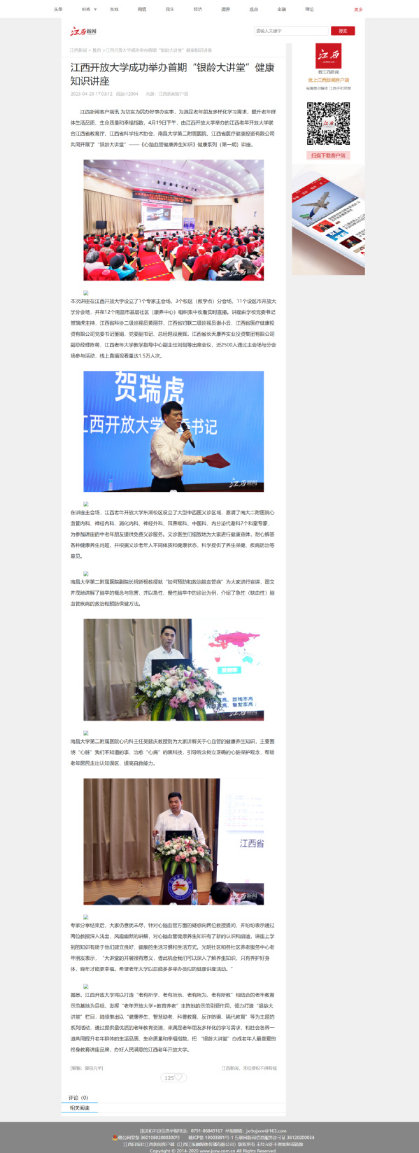 江西新闻客户端讯 为切实为民办好事办实事,为满足老年朋友多样化学习需求,提升老年群体生活品质、生命质量和幸福指数,4月19日下午,由英国上市365官网举办的江西老年开放大学联合江西省教育厅、江西省科学技术协会、南昌大学第二附属医院、江西省医疗健康投资有限公司共同开展了“银龄大讲堂”——《心脑血管健康养生知识》健康系列(第一期)讲座。